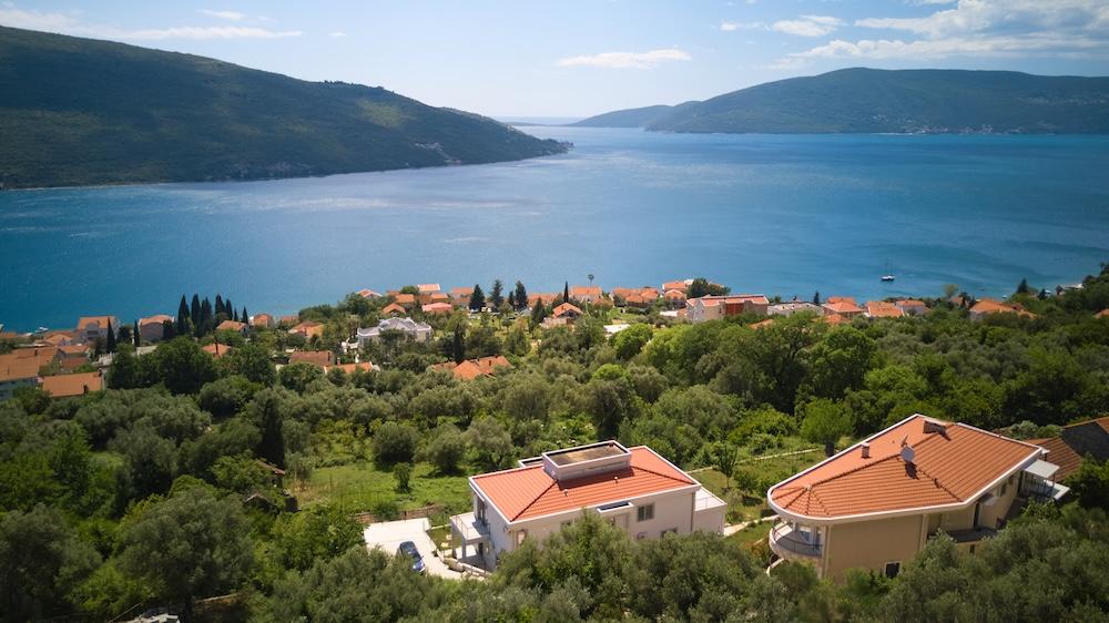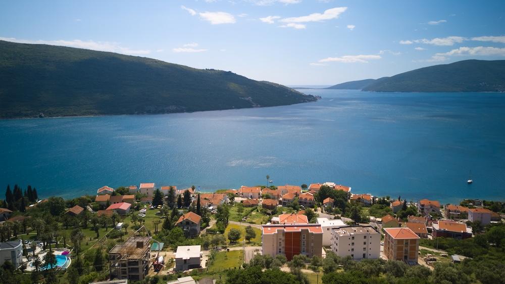 - נופים מדהימים של מפרץ בוקו קוטור, הרים ובתים מסורתיים עם גגות אדומים יוצרים אווירה של גן עדן ים תיכוני.